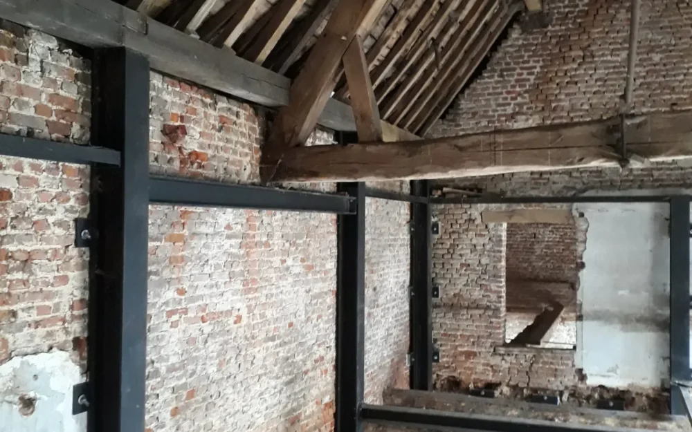 In het bewuste kasteel was er een acuut stabiliteitsprobleem in een van de zijvleugels. Die zijvleugel heeft geen specifieke functie. En net dat gaf de mogelijkheid om een originele oplossing uit te voeren. ARCHICON ontwikkelde een staalconstructie om binnenin het volume op te bouwen. Totaal buiten het zicht aan de buitenkant. Eens opgebouwd nam de staalconstructie het volledige gewicht van de dakconstructie over. Om zo de muren te ontlasten. Meer nog, die muren kregen nieuwe ankerpunten op de staalconstructie waardoor hun stabiliteit maximaliseerde. Van op die stabiele basis volgde een grondige aanpak van het leien-dak.