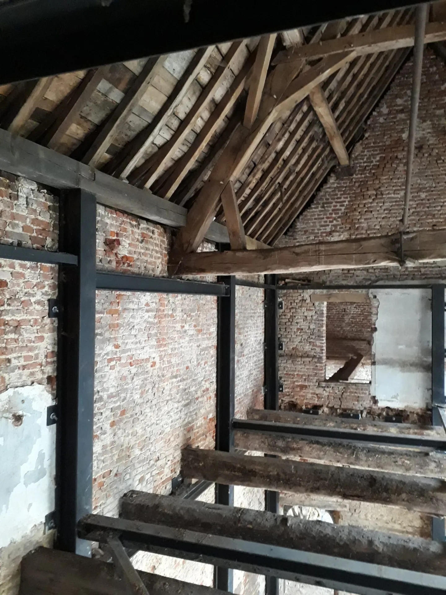 In het bewuste kasteel was er een acuut stabiliteitsprobleem in een van de zijvleugels. Die zijvleugel heeft geen specifieke functie. En net dat gaf de mogelijkheid om een originele oplossing uit te voeren. ARCHICON ontwikkelde een staalconstructie om binnenin het volume op te bouwen. Totaal buiten het zicht aan de buitenkant. Eens opgebouwd nam de staalconstructie het volledige gewicht van de dakconstructie over. Om zo de muren te ontlasten. Meer nog, die muren kregen nieuwe ankerpunten op de staalconstructie waardoor hun stabiliteit maximaliseerde. Van op die stabiele basis volgde een grondige aanpak van het leien-dak.
